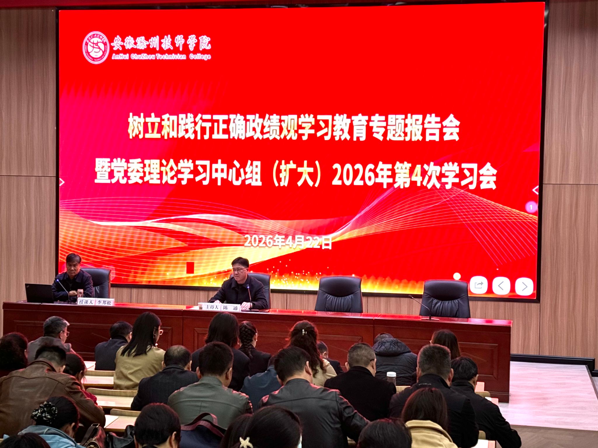为深入学习贯彻习近平总书记关于树立和践行正确政绩观的重要论述,统筹推进专题学习与理论武装,4月22日下午,我校在经贸楼一楼报告厅召开树立和践行正确政绩观学习教育专题报告会暨四月份党委理论学习中心组(扩大)学习会议。滁州市委宣讲团成员李邦松应邀作专题宣讲,学校党委书记陈通主持会议,校党委班子成员、全体教职工参加会议。