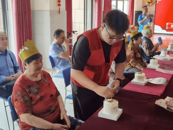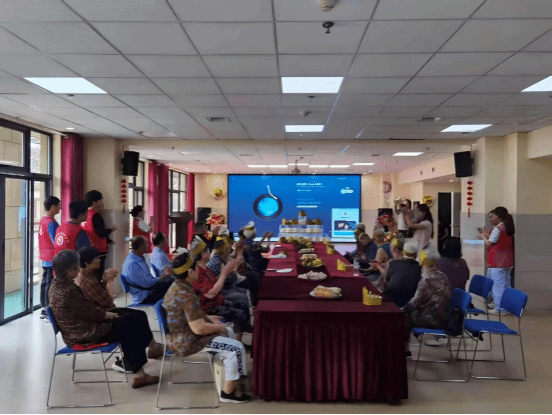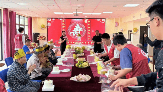 活动现场被“小齿轮”志愿者们布置的彩带和气球装点得喜庆而温馨,“祝老寿星们福如东海,寿比南山”的横幅格外醒目。“小齿轮”志愿者们在桌上摆满了水果、点心和精心准备的巨型生日蛋糕,处处洋溢着欢乐祥和的气氛。