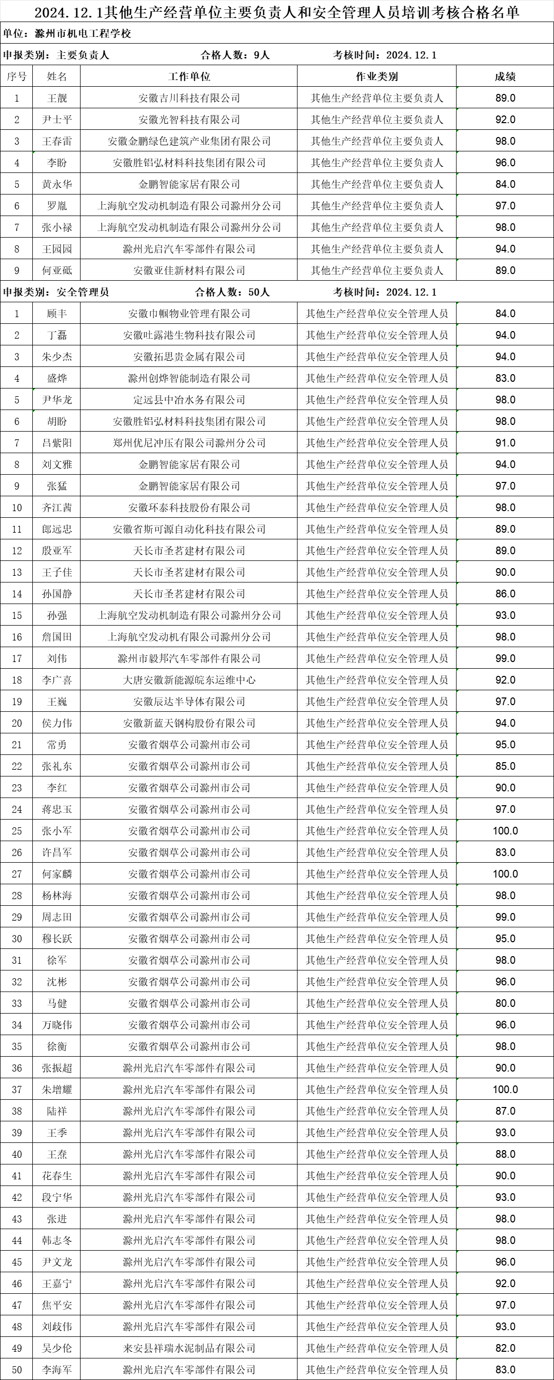 2024年12月1日 其他生产经营单位主要负责人和安全管理人员培训考核合格名单