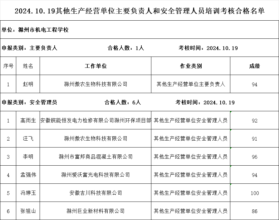 2024年10月19日 其他生产经营单位主要负责人和安全管理人员培训考核合格名单