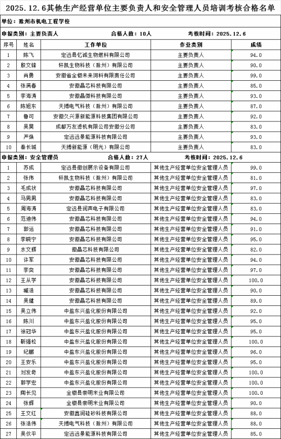 2025年12月6日其他生产经营单位主要负责人和安全管理人员培训考核合格名单