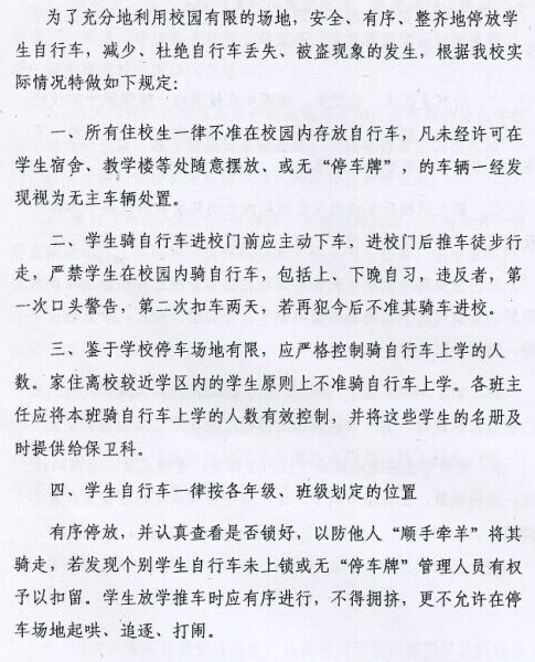 滁州市机电工程学校学生自行车管理规定