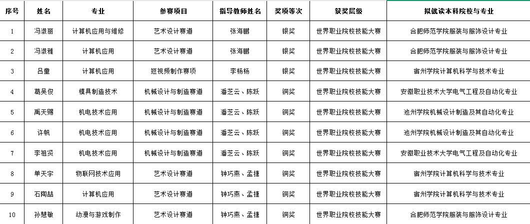 “技能竞赛架金桥,中职学子跃龙门”,2026年我校10名学子凭借世界职业院校技能大赛优异成绩,成功保送,提前被合肥师范学院、宿州学院、池州学院、安徽职业技术大学四所公办本科院校录取,再度彰显了我校“竞赛赋能升学、技能改变命运”的育人实效。