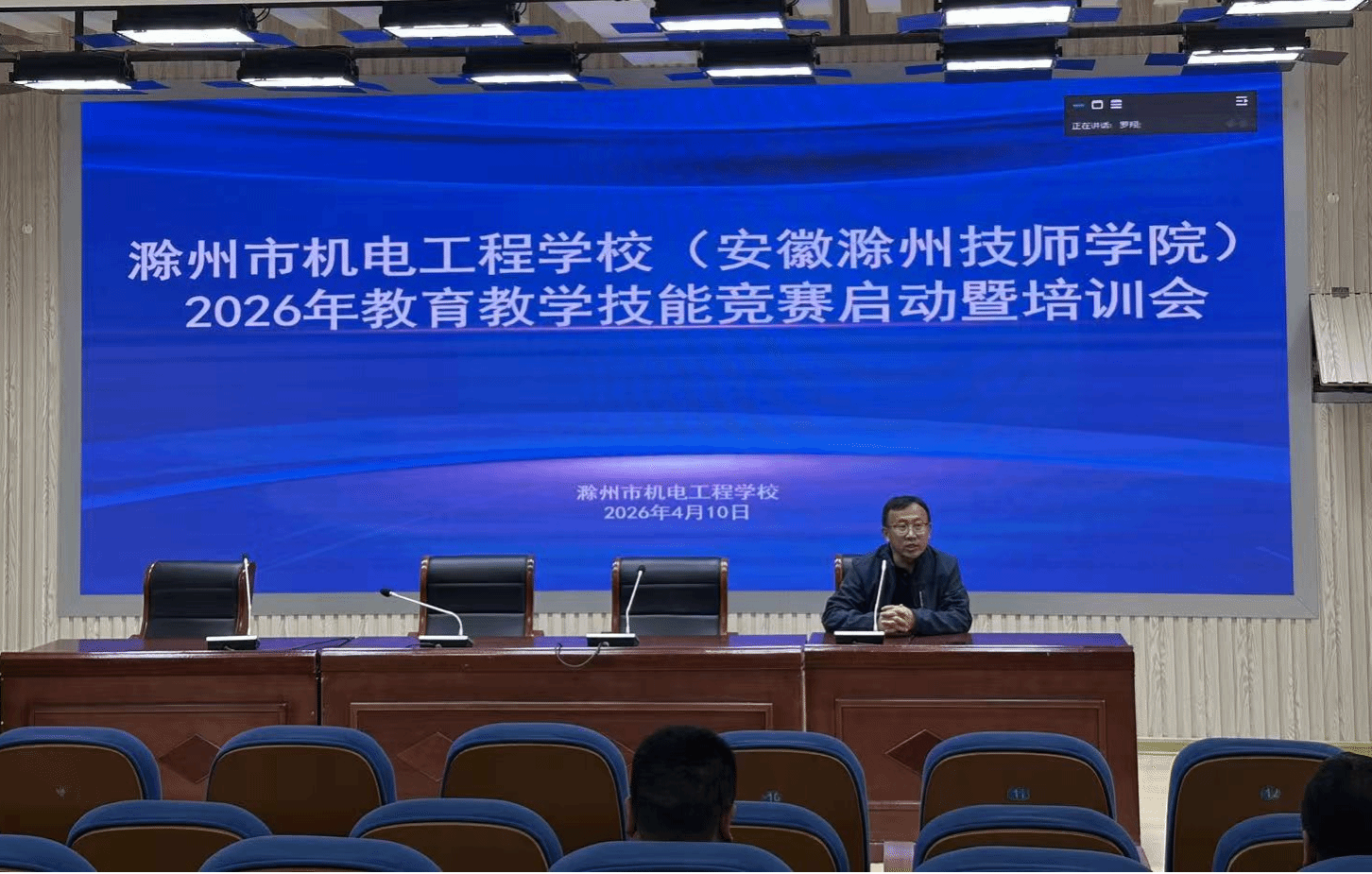 4 月 10 日下午,滁州市机电工程学校(安徽滁州技师学院)2026 年教育教学技能竞赛启动暨培训会在新、老校区同步召开,各教学系管理人员、参赛教师及 40 岁以下青年教师全员参会。