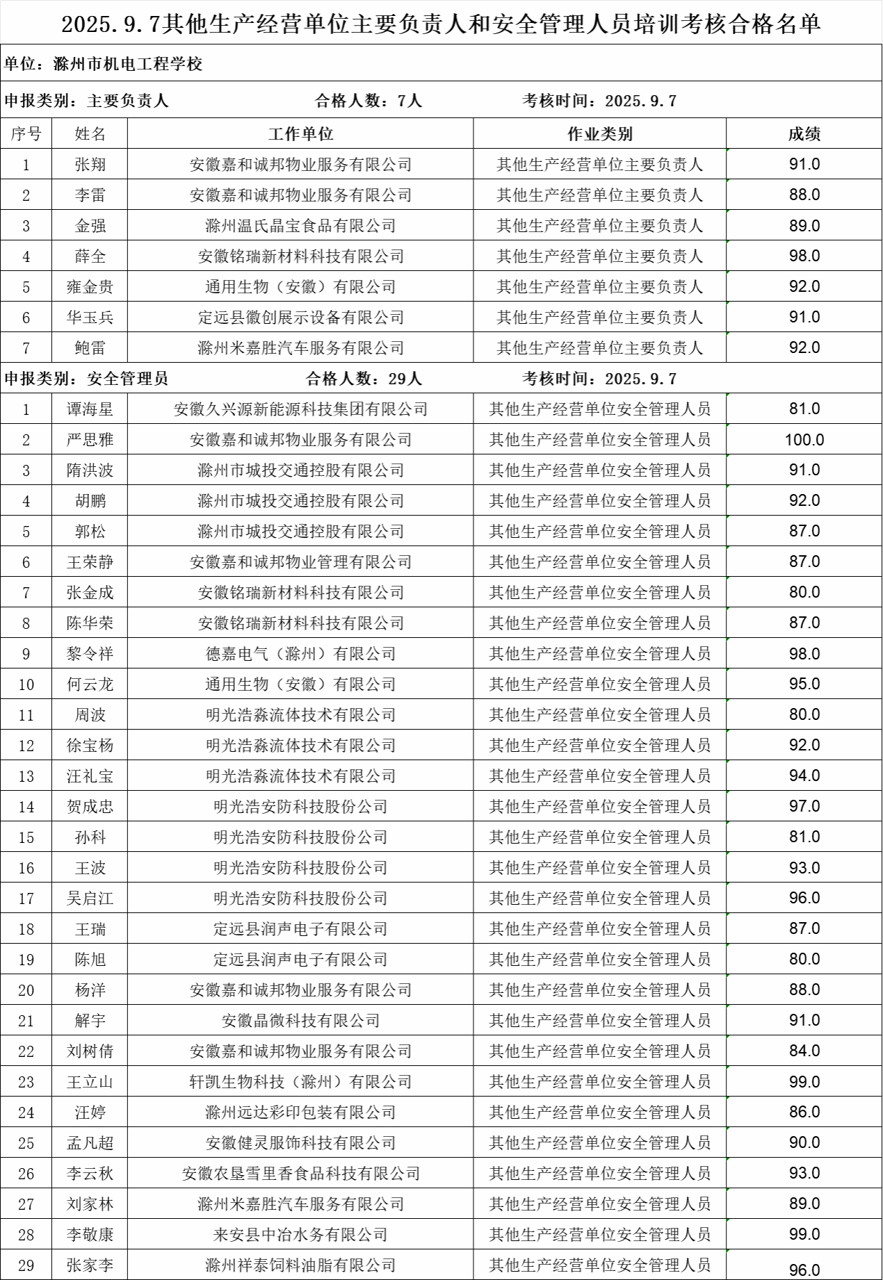 2025年9月7日 其他生产经营单位主要负责人和安全管理人员培训考核合格名单