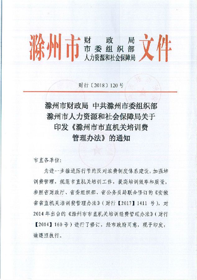 滁州市财政局 中共滁州市委组织部 滁州市人力资源和社会保障局关于印发《滁州市市直机关培训费管理办法》的通知.pdf