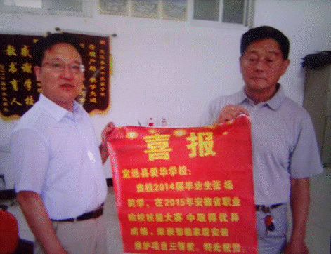 这次招生宣传工作的另一内容就是把荣获省技能大赛三等奖的我校定远籍学生张杨同学的喜报和奖牌送达张杨同学的初中毕业母校——定远县爱华中学。当爱华中学的刘校长接过喜报时,对我校教育教学工作连声称赞,并表示愿为我校多多输送优质生源。
