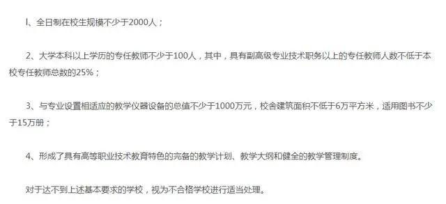 第八,位于边远地区、民办或特殊类别的高等职业学校,在设置时,其办学规模及其相应的办学条件可以适当放宽要求。