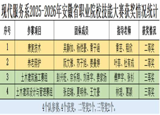 在2025-2026年度安徽省职业院校技能大赛中,我校现代服务系参赛队伍表现亮眼、斩获佳绩,康复技术赛项获二等奖项,养老照护赛项获二等奖项,土木建筑施工、土木建筑设计与管理赛项均获三等奖项,其中护理专业首次参赛便拿下省赛二等奖,尽显专业建设与技能人才培养的扎实成效。
