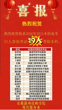 在刚刚落幕的2026年安徽省对口高考中,我校23级对口班传来喜讯:21人参加对口本科考试,19人达线录取,本科录取率达90.47%,创我校并校以来最好成绩,在省内同类中职院校中位居前列。